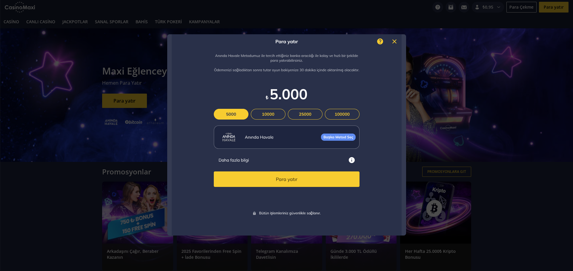 Anında Havale banka havalesi ile yatırım yapmak isteyen kullanıcılarımıza sunduğumuz bir yöntem. Bu yöntem ile oyun hesabınıza yatırım yapmak çok daha hızlı ve kolay.