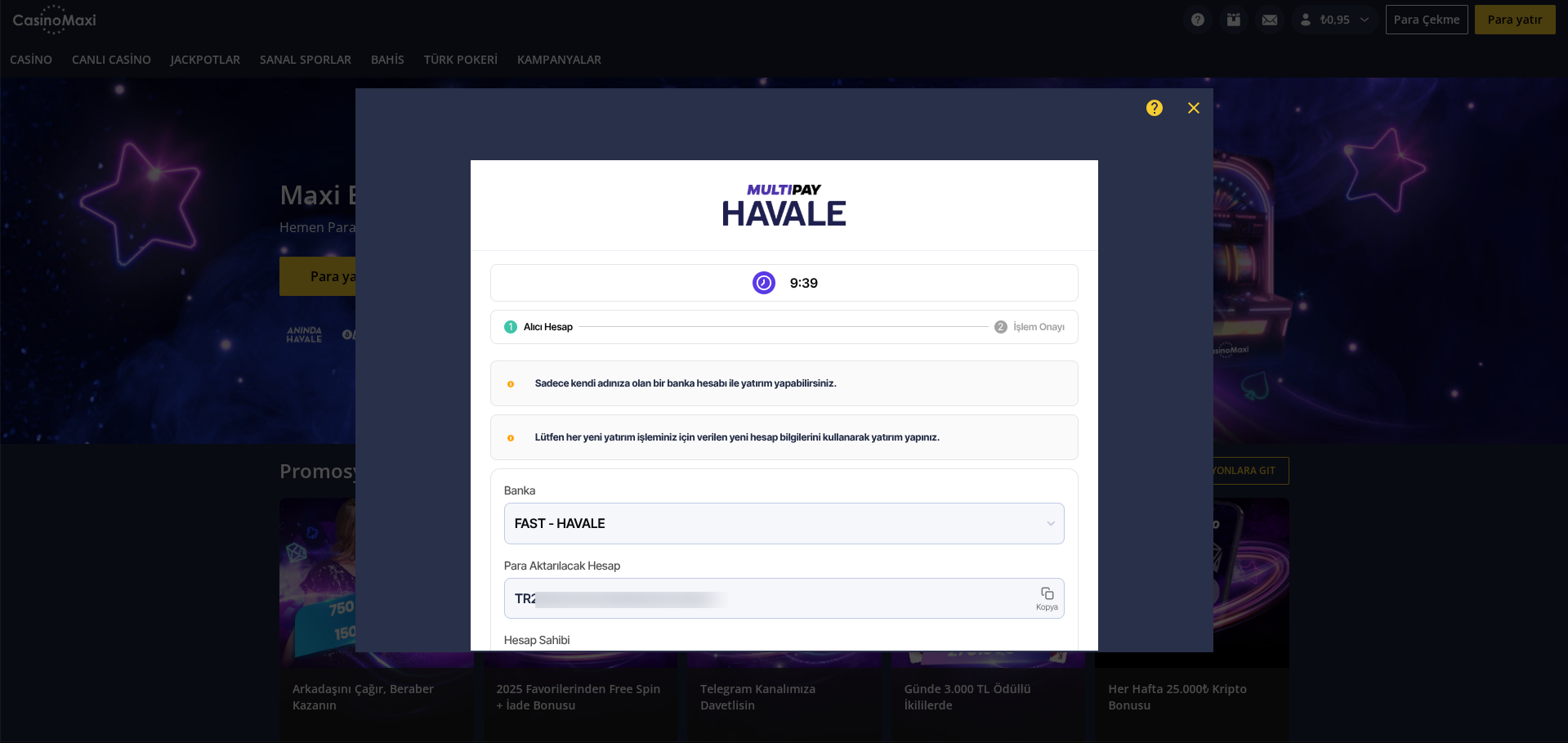 * Para yatırma işlemi başlatıldıktan sonraki beş dakika içerisinde tamamlanmalıdır.